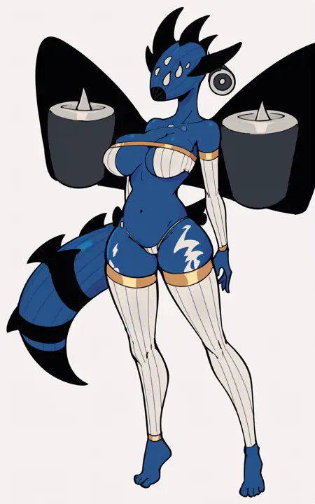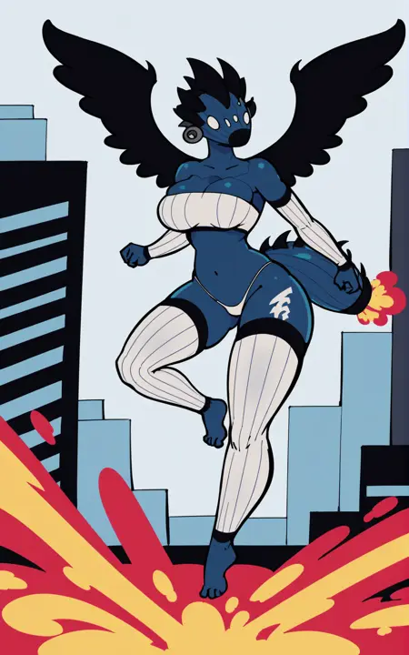 強化タグ: 脚のタトゥー、白いタトゥー、複数の目、角、黒い翼、青い肌、多色の肌、尾、モンスター娘、黒い鼻、口なし、突起、黒い突起、白い目
