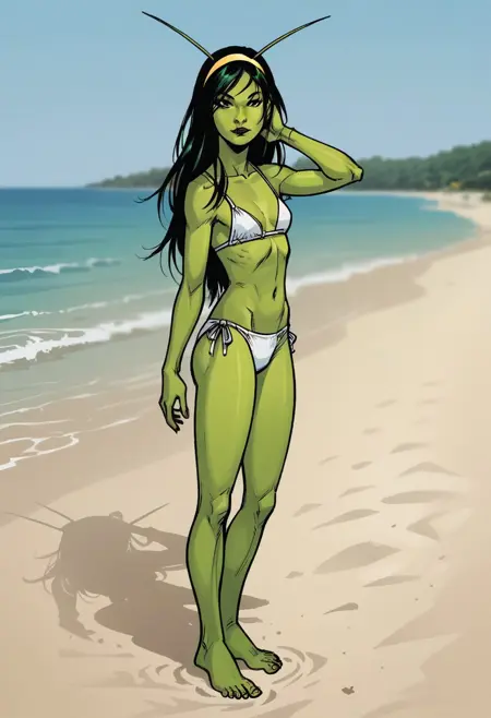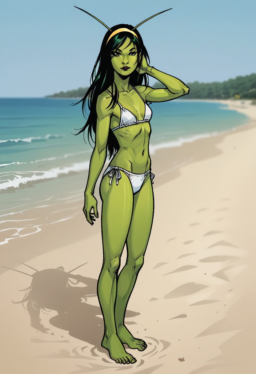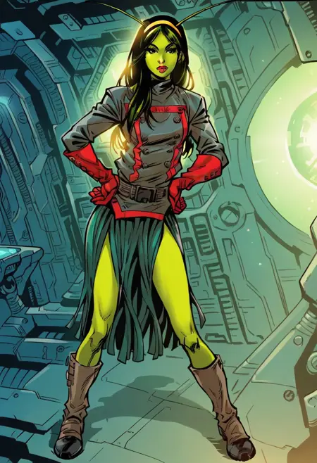 一般的なプロンプト:commantis、緑色の肌、触角、黒い目、緑の髪、黒い髪、長い髪、黄色いヘアバンド、pface3、ベルト、赤い手袋、ネイビーのスカート、ネイビーのジャケット、ボタン、ツートーンの靴