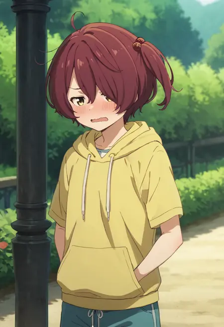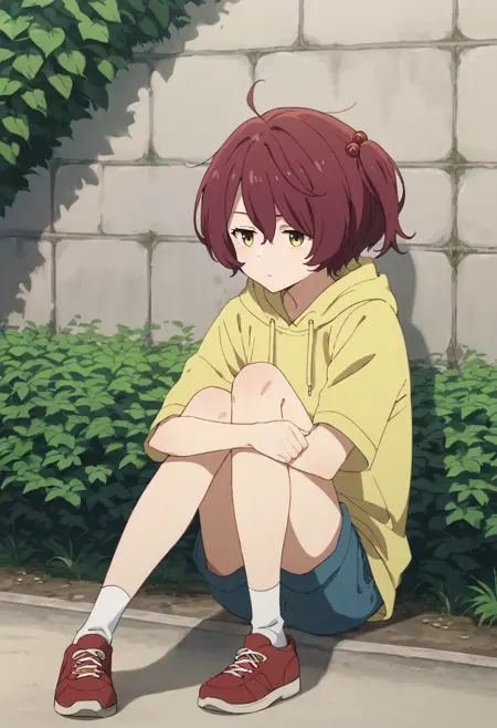 chika-casual,komari chika,yellow eyes,red hair,hair over one eye,one side up,hair bobbles,yellow hoodie,blue shorts,white socks,red sneakers