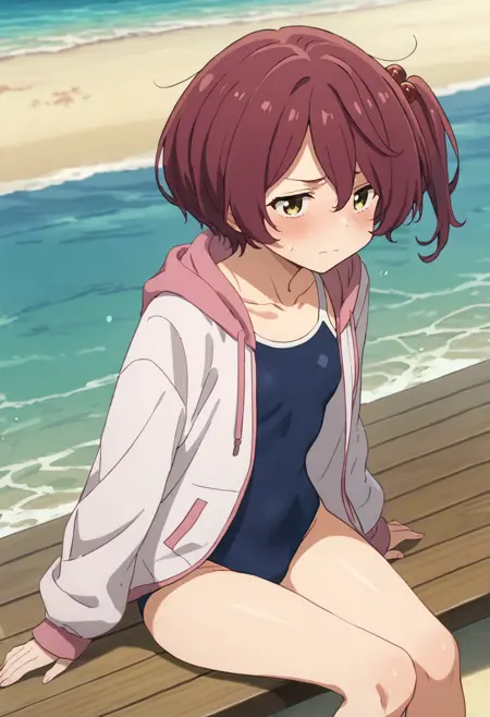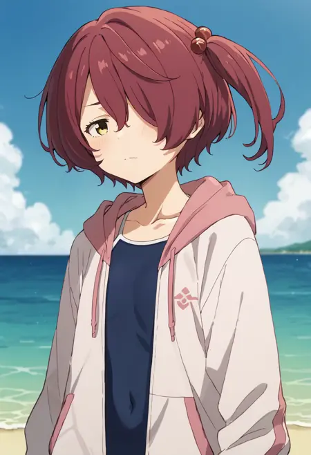 chika-swimsuit,komari chika,yellow eyes,red hair,hair over one eye,one side up,hair bobbles,white hoodie,pink hood,open hoodie,swimsuit,blue one-piece swimsuit