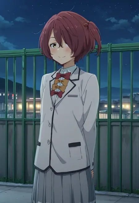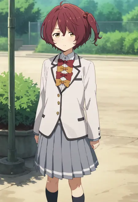 chika-default,komari chika,yellow eyes,red hair,hair over one eye,one side up, hair bobbles,school uniform,white jacket,bowties,long sleeves,grey skirt,black socks,loafers