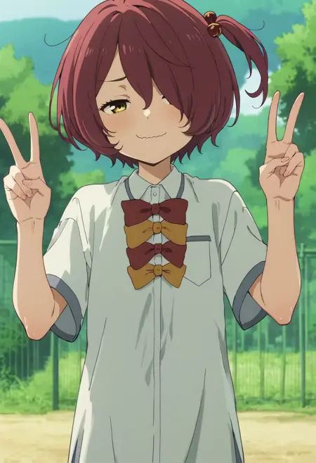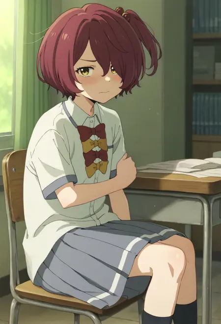 chika-default,komari chika,yellow eyes,red hair,hair over one eye,one side up, hair bobbles,school uniform,white shirt,bowties,oversized clothes,short sleeves, grey skirt,black socks,loafers