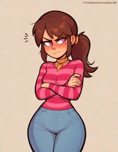 棕色头发,马尾,眼下痣,黄色领巾,条纹衬衫,蓝色裤子,黑色平底鞋