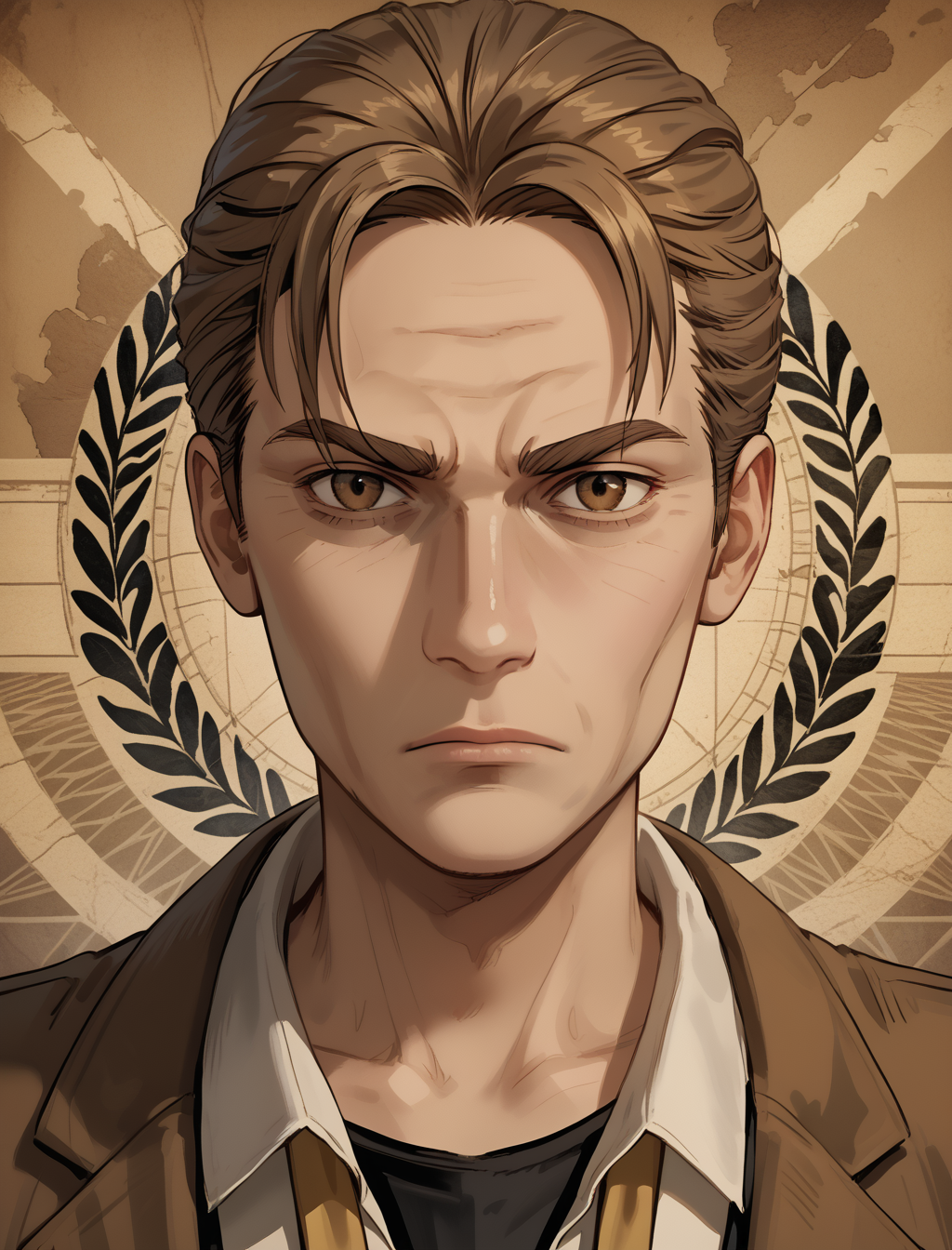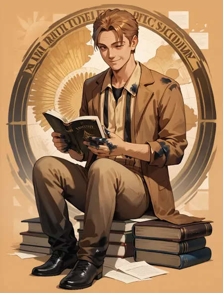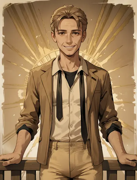 brown jacket, yellow vest, black shirt, untied necktie, yellow pants
