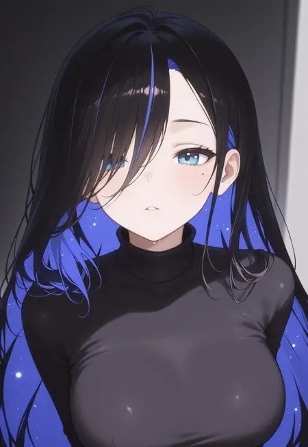 eclipsedef, huge_breasts, blue_eyes, long hair, black_hair, colored inner hair, multicolored hair, blue_hair, horns, broken_horn, accessories, purple_leotard, cleavage, bare shoulders, frills, black_gloves, bat_wing_curtain, black_cutout_high_socks, toes,