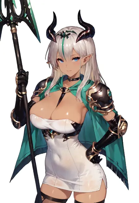 nebrisdef, huge_breasts, dark_skin, pointy_ears, blue_eyes, bangs, ivory hair, multicolored_hair, green_streaked_hair, horns, tiara_hairband, white_dress, strapless_mini_dress, black_gold_armor, shoulder_armor, gauntlets, jewelry, black_choker, green_shawl, white_sandals, toeless_footwear,