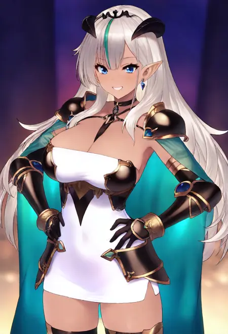 nebrisdef, huge_breasts, dark_skin, pointy_ears, blue_eyes, bangs, ivory hair, multicolored_hair, green_streaked_hair, horns, tiara_hairband, white_dress, strapless_mini_dress, black_gold_armor, shoulder_armor, gauntlets, jewelry, black_choker, green_shawl, white_sandals, toeless_footwear,