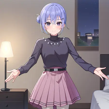 (hanasuzukic2), short hair, hair bun, hana2-belt, hana2-hairclip, hana2-turtleneck, hana2-pantyhose, hana2-pleated skirt,hana2-high heels,