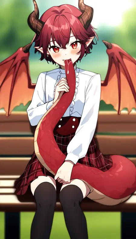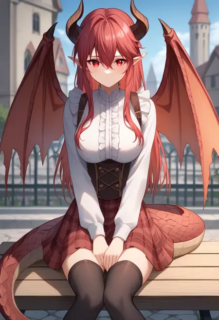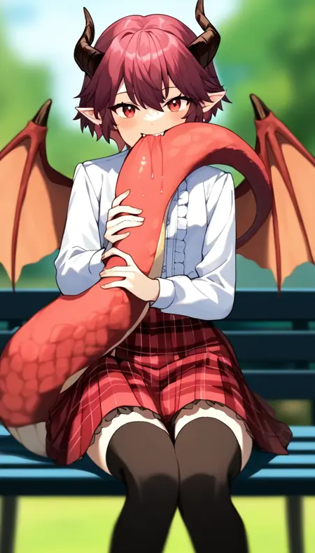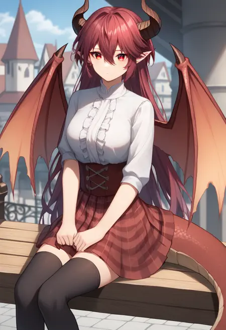P: black horns, black wings, black dragon tail, black scales, black hair, dark purple eyes, black shirt, black high-waist, black pleated skirt, black plaid skirt
