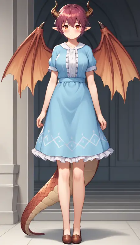 Overall the LoRA should be pretty flexible. As in changing hair or eye color or style shouldn't be a problem although sometimes you need to add more weight or put the default color in negative when a color change isnt working. The high-waist skirt from default outfit seems to need extra work with color change. The wings seem to be trickier ("blue wings" for example made them completely blue but sometimes spilled over to the tail and "black wings" just kept the membranes at default color).