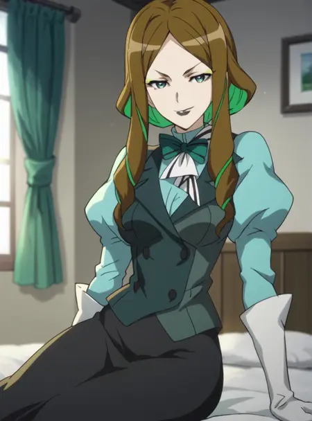 Prompts:1girl, black lips, multicolored hair, two-tone hair, solo, makeup, brown hair, green hair, long hair, colored inner hair, gloves, lipstick, eyeshadow wide hips, narrow waist, dress