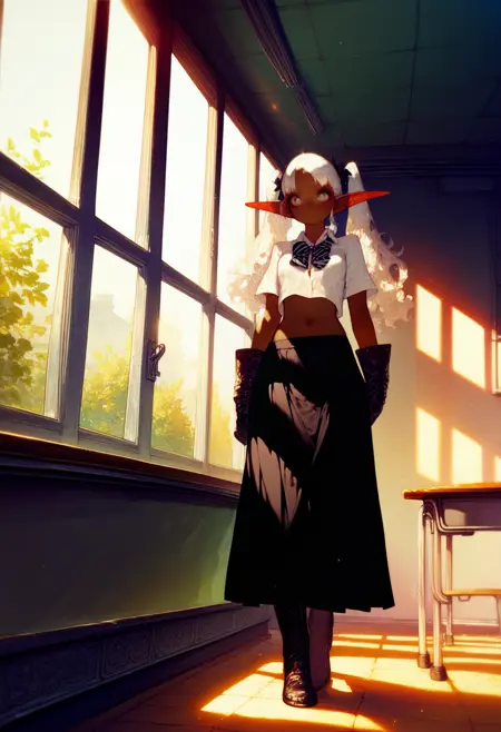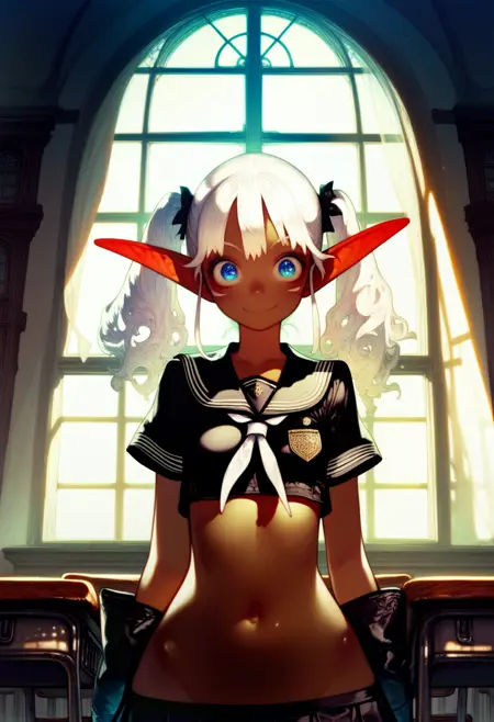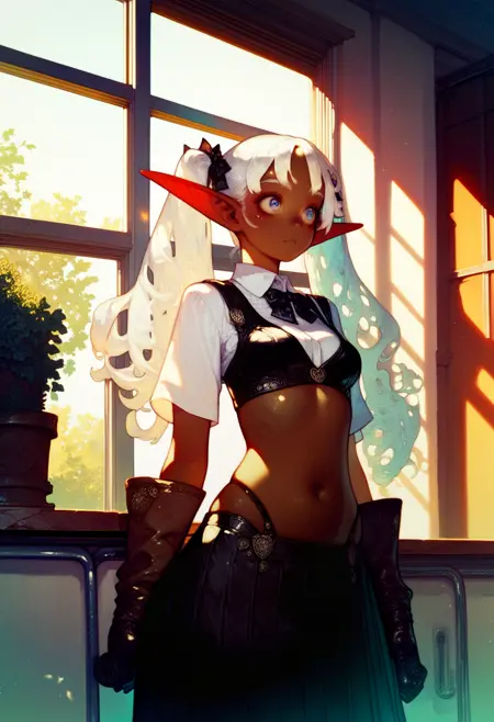 TAGS TO USE: daceltystyle, solo, elf, dark skin, white hair, twintails, gloves, blue eyes, navel, schoolgirl outfit, miniskirt, etc.