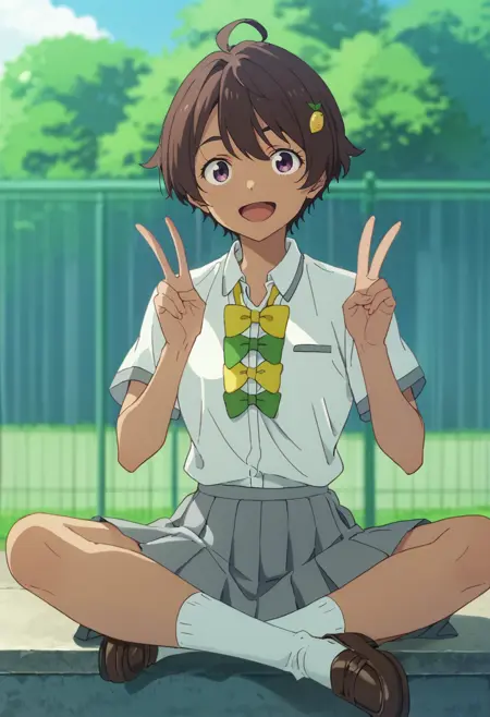 remon-default,yakishio lemon,purple eyes,brown hair,short hair,hair ornament,school uniform,white shirt,short sleeves,bowties,grey skirt,pleated skirt,white socks,loafers