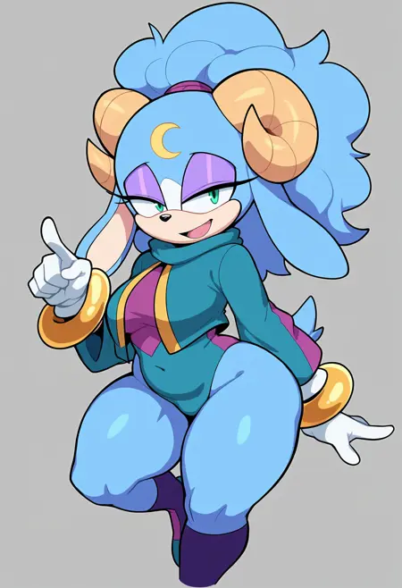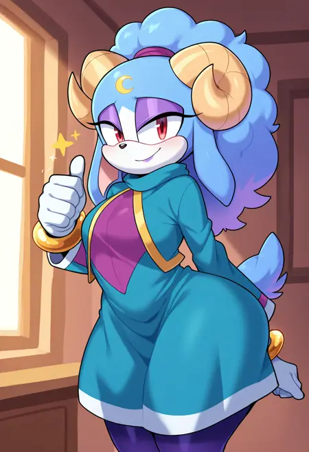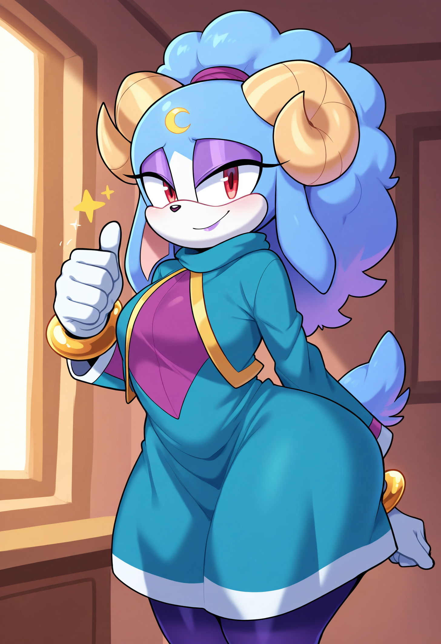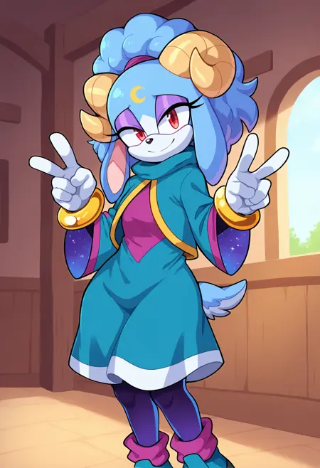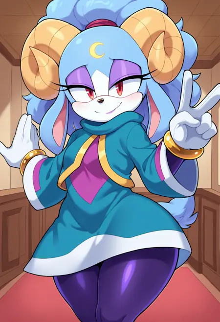 タグ:青い体毛、青い髪、ブレスレット、ジュエリー、長袖、羊の角、紫色の化粧、三日月の額の模様、白い口吻の毛、赤い目