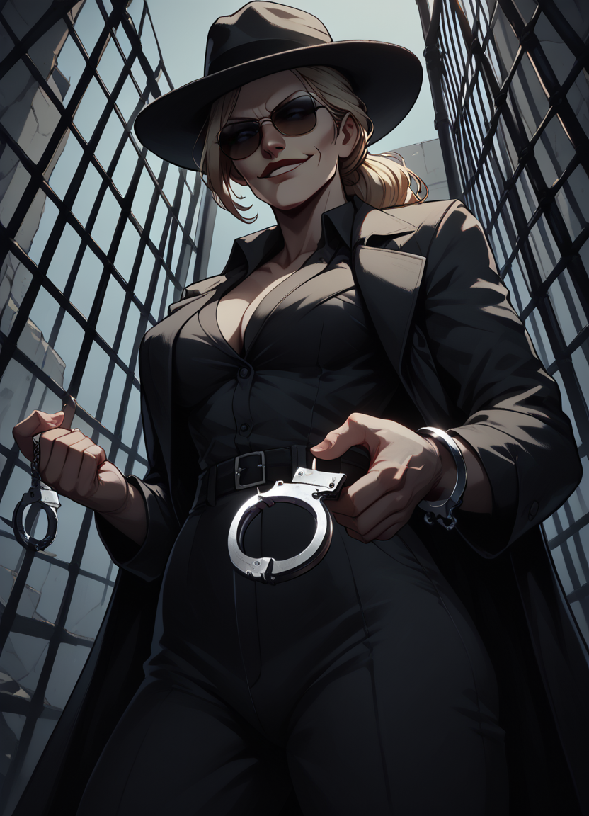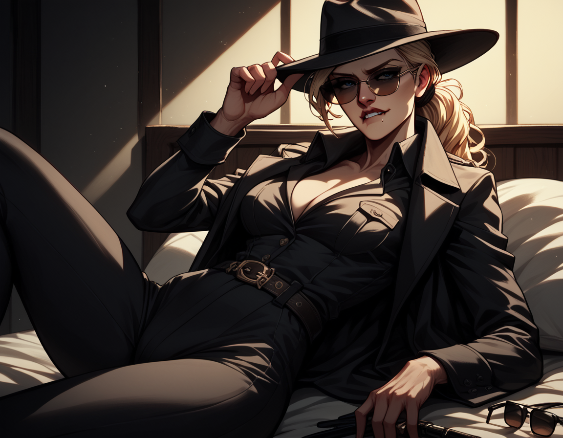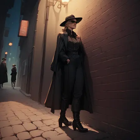 black_fedora - Incog이 밖에 있을 때 머리에 쓰는 페도라 모자, black trench coat와 함께.