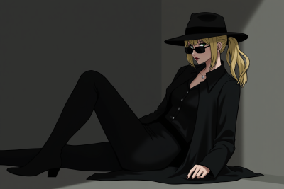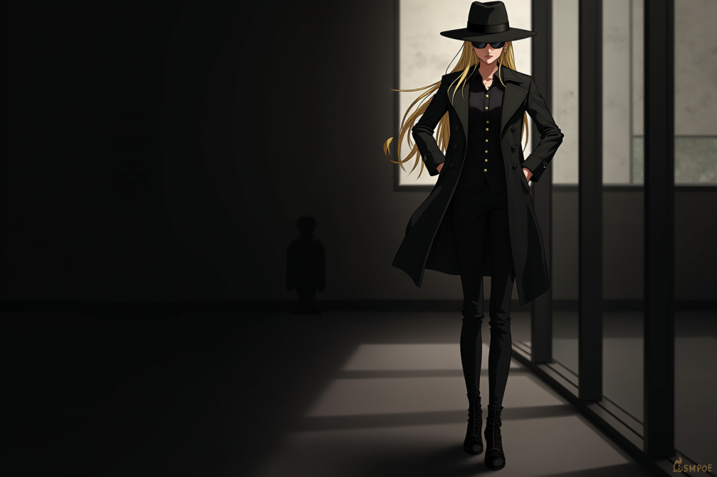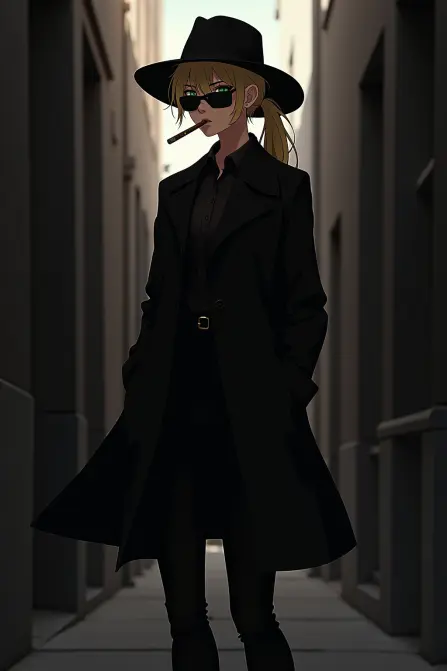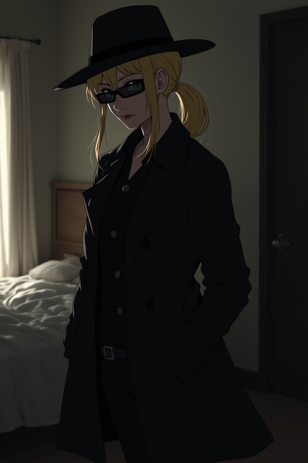 black_fedora - Incog이 밖에 있을 때 머리에 쓰는 페도라 모자, black trench coat와 함께.