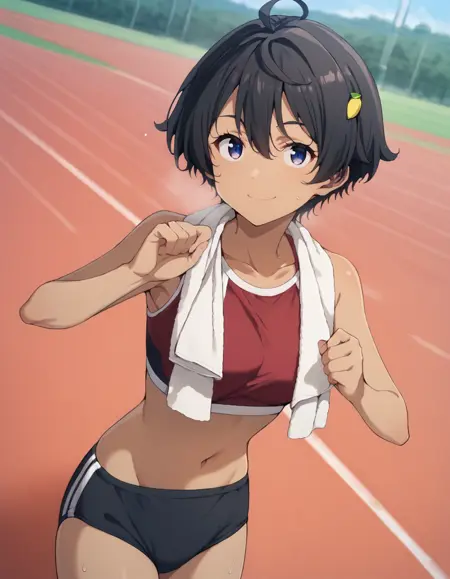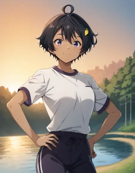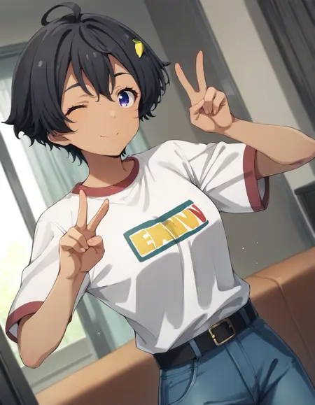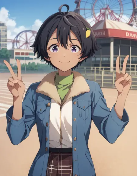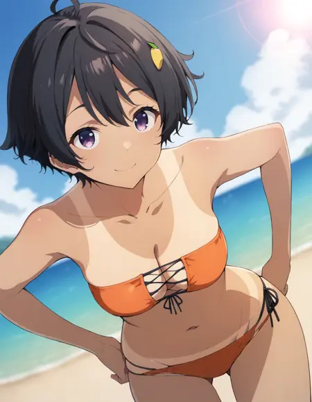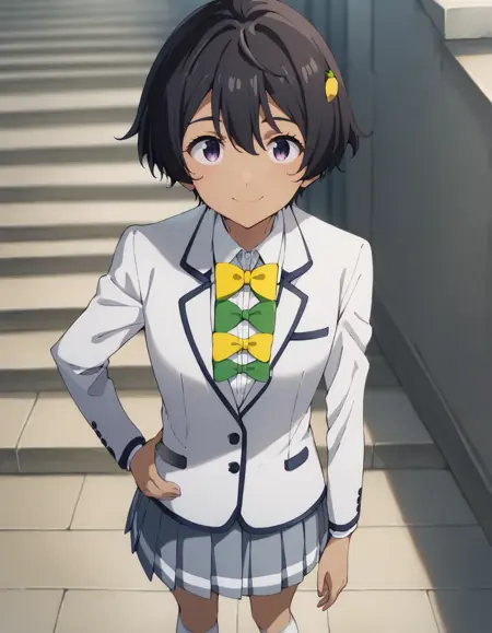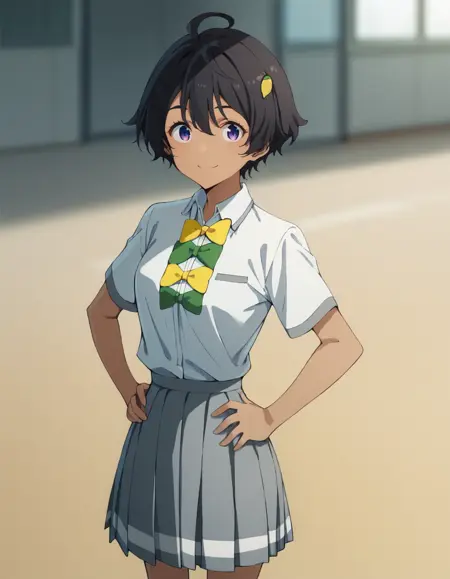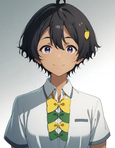 lemon yakishio, short hair, black hair, hair between eyes, ahoge, lemon hair ornament, dark purple eyes, dark skin