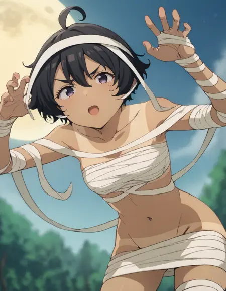 mummy costume, collarbone, tanlines, naked bandage, navel