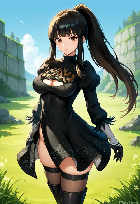 裙子: "twobskirt, nier dress, cleavage cutout, skirt, thighhighs under boots,"