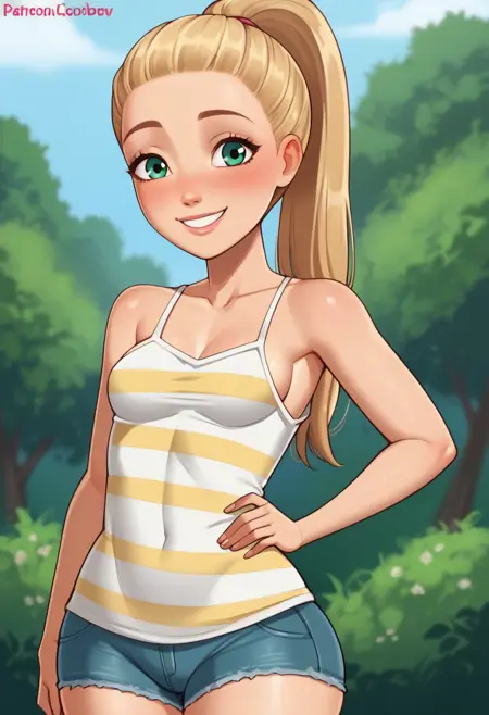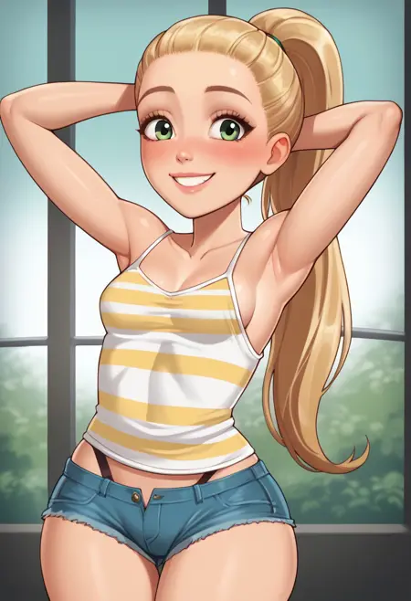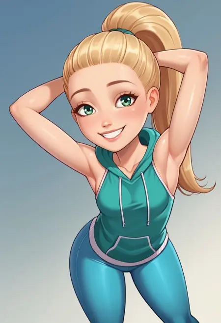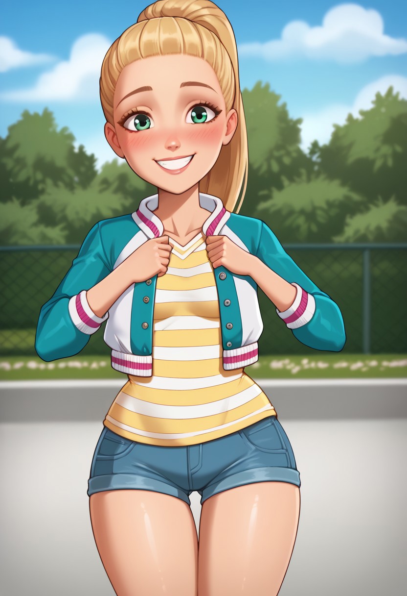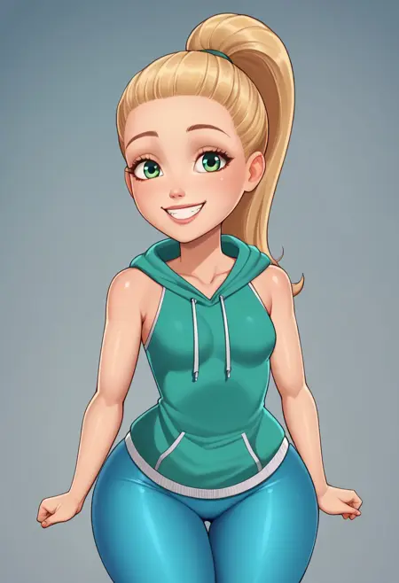 | 학습된 단어 | StacieRoberts2, 1girl, green eyes, blonde hair, long hair, hair slicked back, high ponytail,복사됨! blue jacket, two-tone jacket, white shirt, striped shirt, yellow stripes, denim shorts복사됨! green hoodie, hoodie, hood down, sleeveless, bare shoulders, blue tights복사됨! |