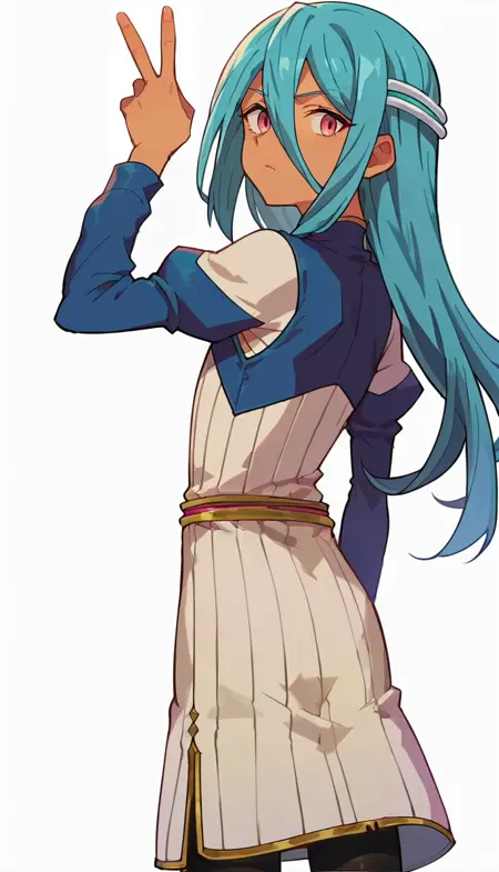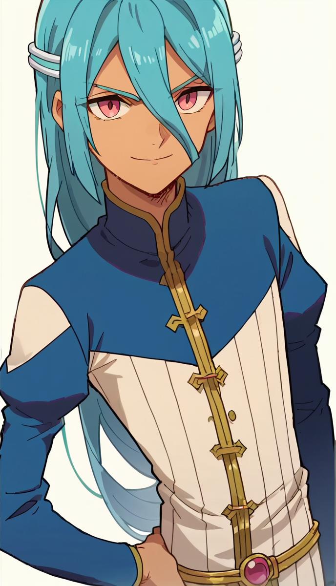 chel, aqua hair, hair between eyes, pink eyes, tan