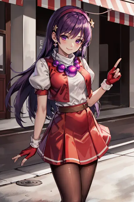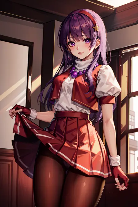 - athena97, purple eyes, purple hair, long hair, white earrings, red hairband, star hair ornament, medium breasts, red vest, white turtleneck, white puffy sleeves, short sleeves, red pleated skirt, (deep red pantyhose:1.2), black pantyhose, yellow belt, purple sphere-shaped necklace, red fingerless gloves, white short socks, red shoes, red fingerless gloves.