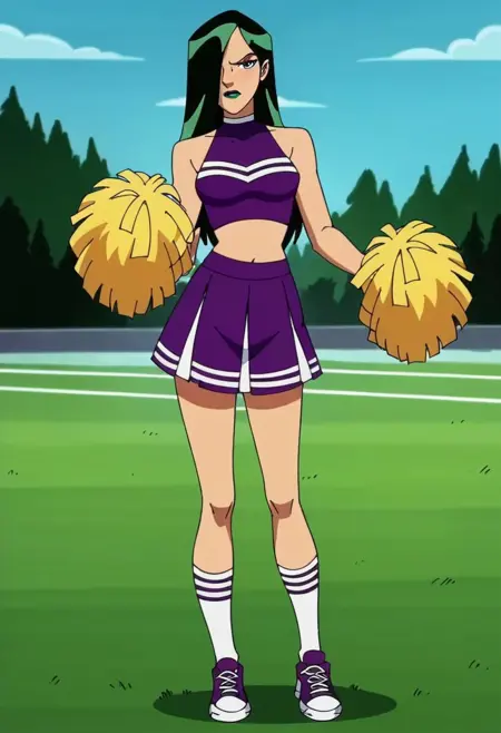 General prompts: emhviper, green hair, hair cover one eye, green lips, green bodysuit, green gloves, black belt, black boots, makeup, two-tone hair, multicolored hair, elbow gloves,