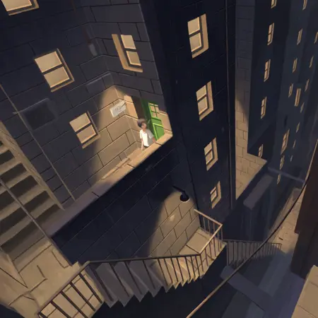 Also: architecture, deep cityscape, lantern, lance vines, overgrown, night, deep wide shot