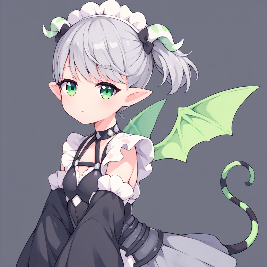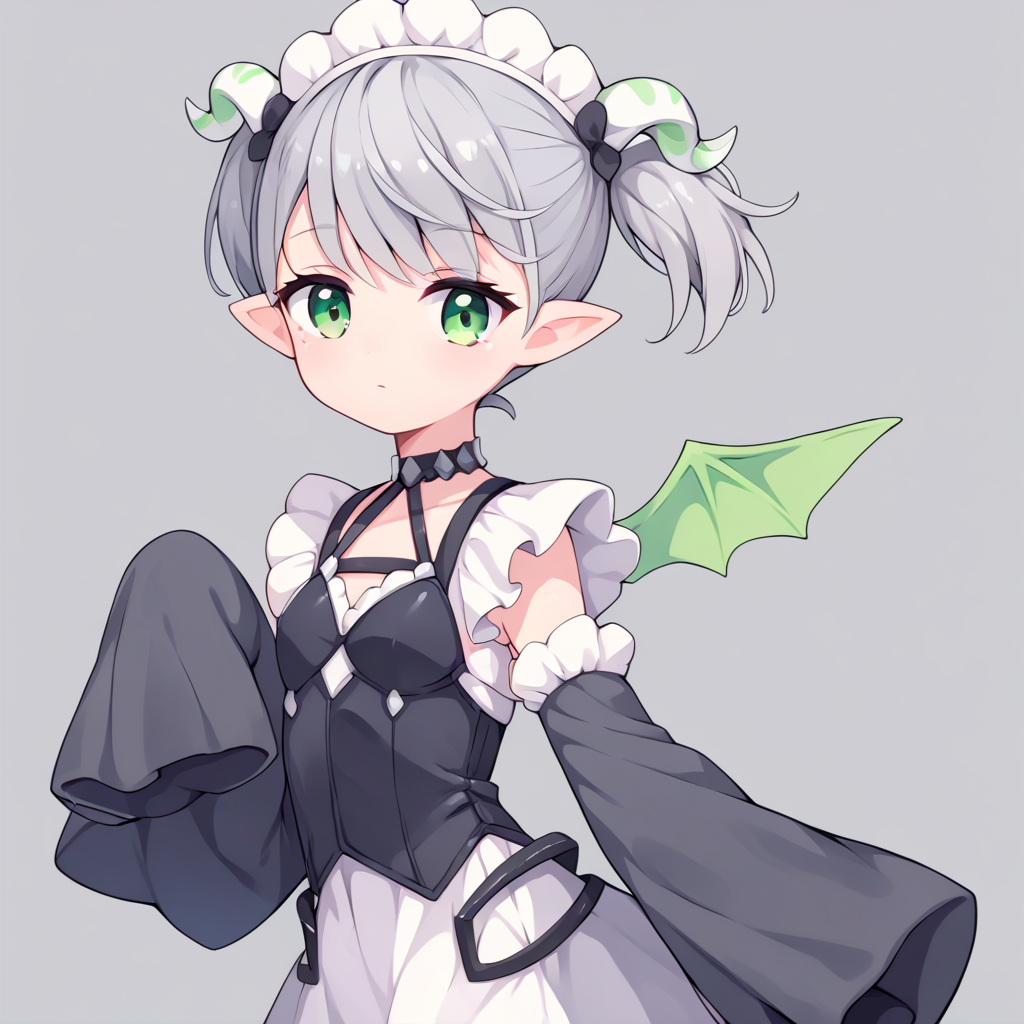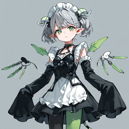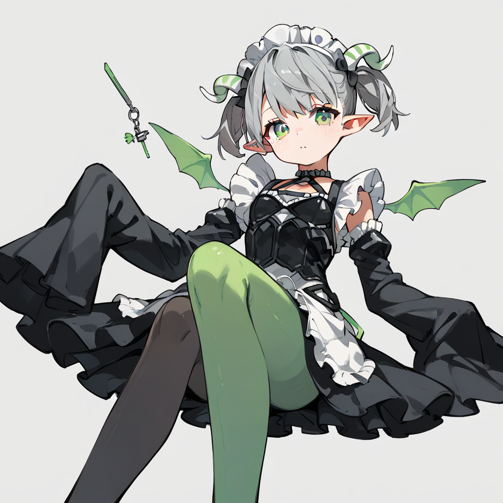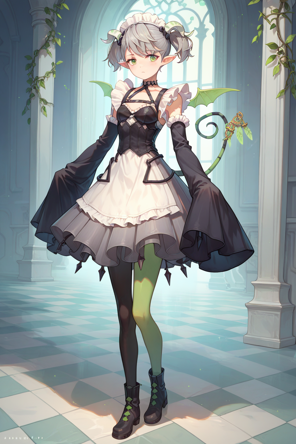 1girl, solo, arianna, grey hair, short twintails, green eyes, horns, mini wings, sleeves past wrists, maid headdress, pointy ears, pantyhose