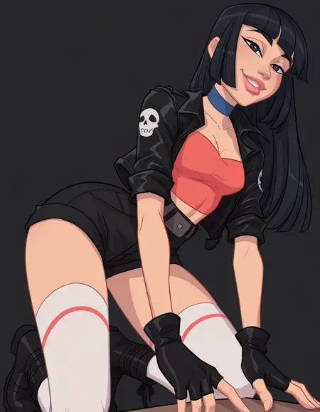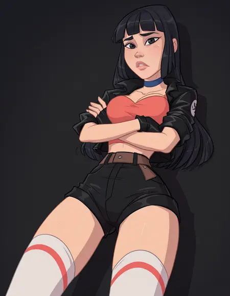 衣装:チョーカー、短めのジャケット、キャミトップ、指なしグローブ、ベルト、ハイウエストショートパンツ、白い膝上ハイソックス、ベルトブーツ