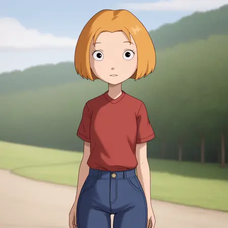 lormcquarrie, 1girl, solo, blonde hair, short hair, black eyes,