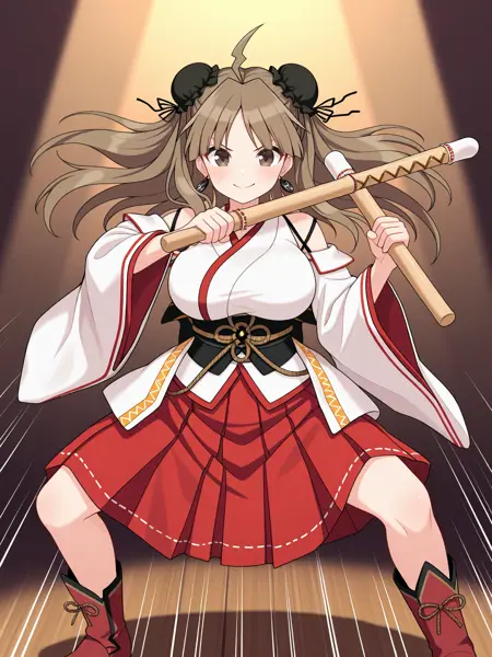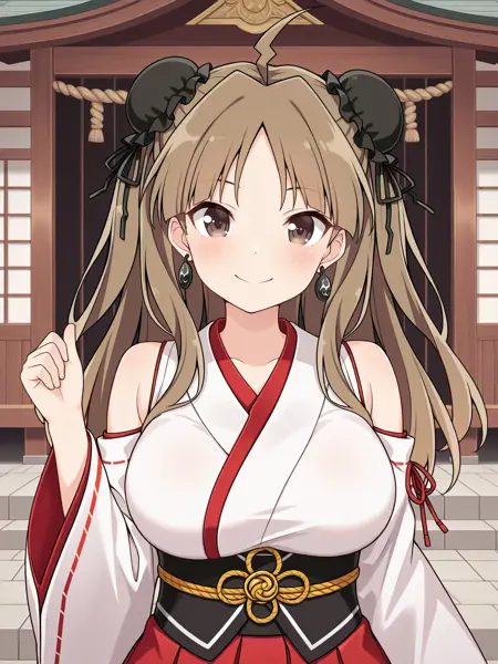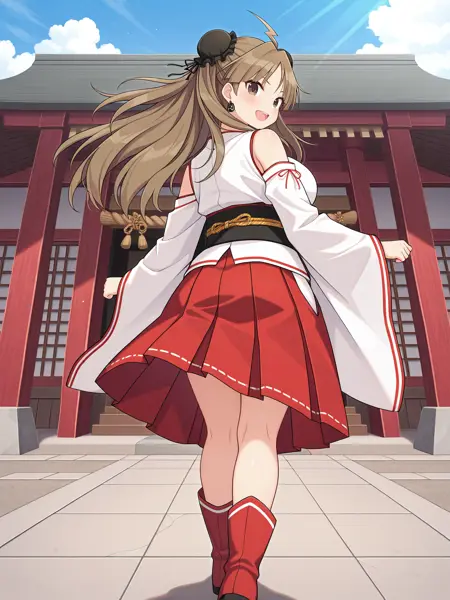 Trigger Words for her shrine outfit are "Renka_Shrine, shrine clothes, japanese clothes, miko clothes, white kimono up, bare shoulders, long sleeves, wide sleeves, obi, sash, hakama skirt, red skirt, red boots".