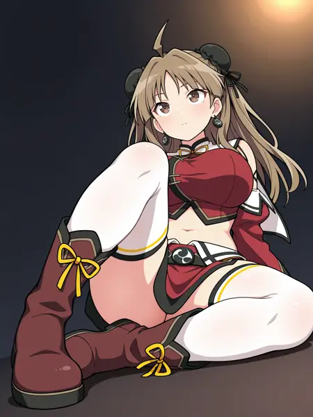 Trigger Words for shinobi outfit are "Renka_Shinobi, chinese clothes, yellow ribbon, crop top, detached sleeves, white cape, miniskirt, white legwear, legwear ribbon, brown boots, boots ribbon".