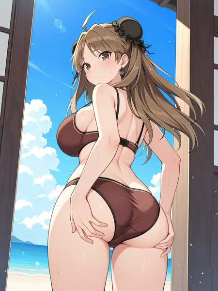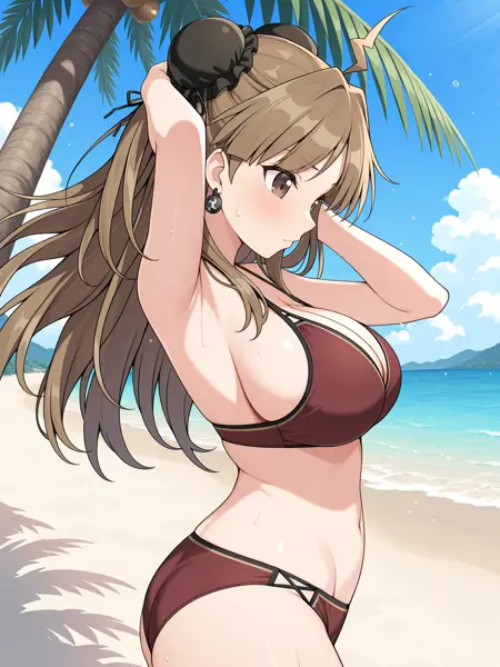 Trigger Words for her swimsuit are "Renka_Swim, brown bikini, brown bra, brown panties".