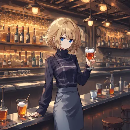 short hair, skirt, blonde hair, long sleeves, turtleneck, blue eyes