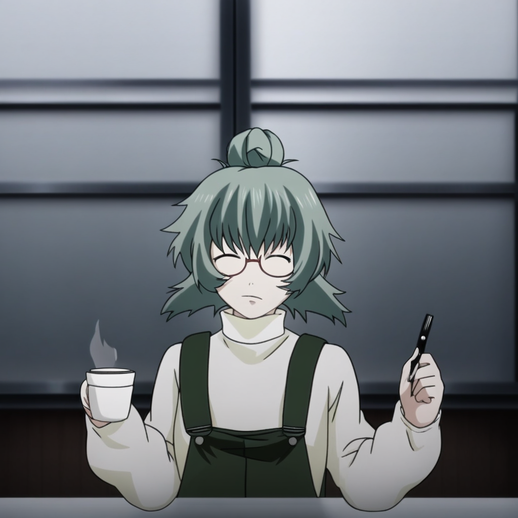 hair bun, overalls, glasses, sweater,