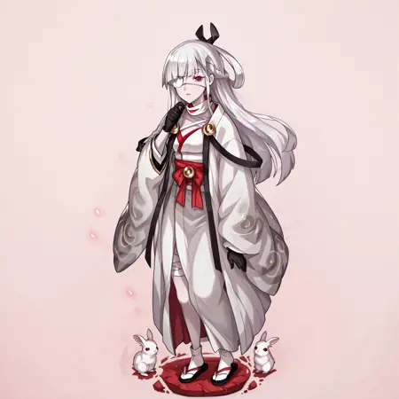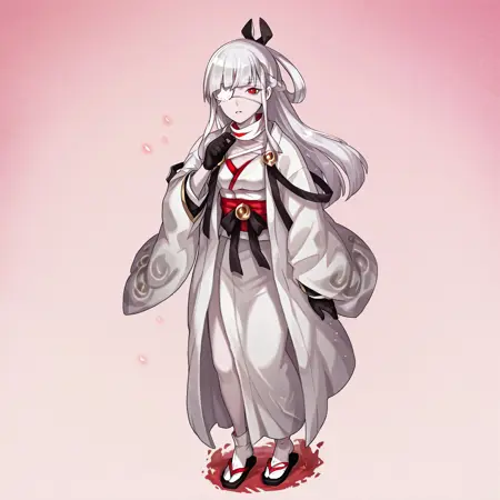 触发词: Kaguya Dragalia,长发,白发,发辫,黑丝带,发带,眼罩,红眼,苍白皮肤,绷带,白色和服,日式服装,胸针,黑色手套,