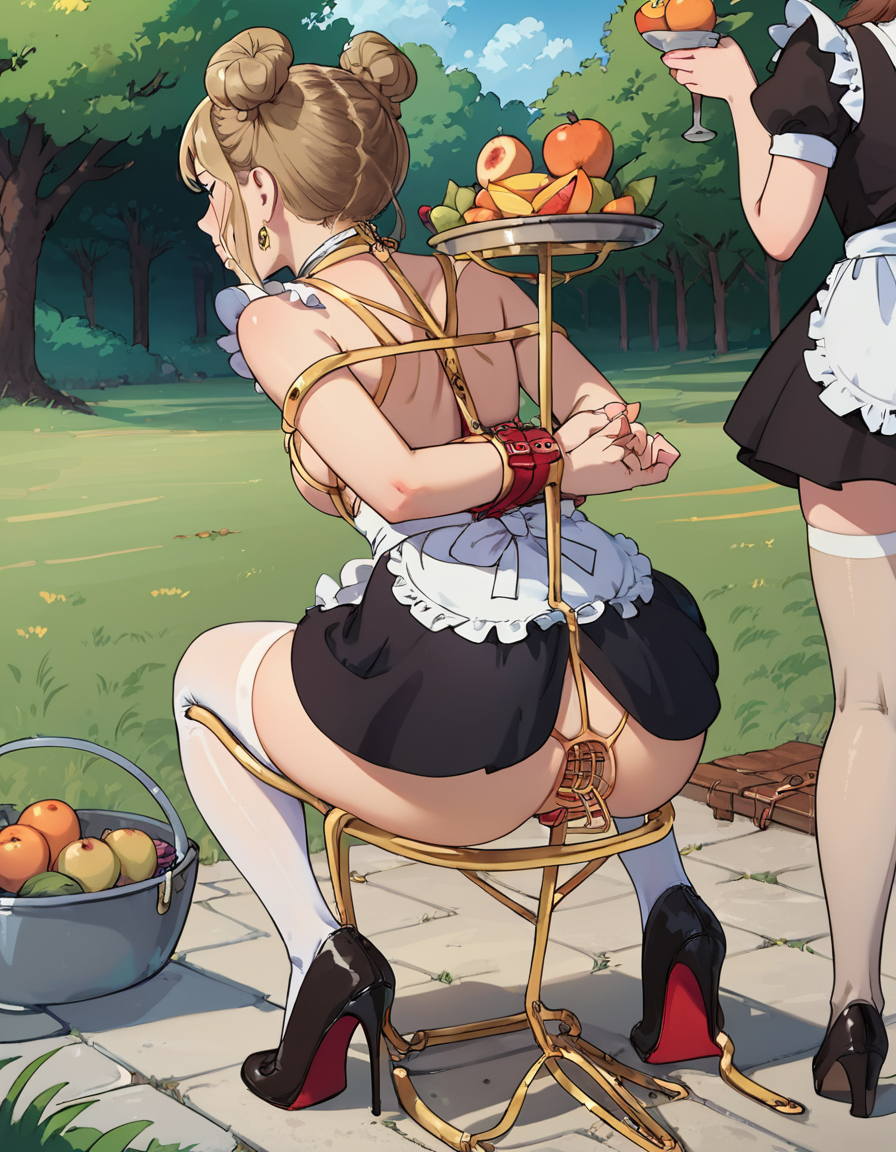 score_9, score_8_up, score_7_up, source_anime, rating_nsfw, anime, 2girls, multiple girls, maid, fruit, thighhighs, bdsm, nude, object insertion, brown hair, apron, anal, outdoors, food, braid, bound, bondage, anal object insertion, blonde hair, femdom, hair bun, what, twintails, dress, shoes, maid apron, gold metal frame, neck of the bottle is inserted into the anus, PFMB