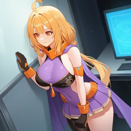 SusannahHi3, Fol003, Ssn_Mng, 金发, 长发, 天线发, 低马尾, 橙色眼睛, 橙色流苏, 遮盖肚脐, 遮盖胸部, 内穿紧身衣, 裸露肩膀, 紫色披风, 紫色斗篷, 荷叶边裙, 百褶裙, 高领, 浅紫色裙子, 橙色腕环, 灰色手套, 黑色手套, 双色手套, 橙色腰带, 披风, 饰品, 黑色胸罩, 黑色连裤袜, 印花胸罩, 带状胸罩, 橙色护甲领, 手臂护环, 内穿紧身衣, 紫色紧身衣, 无袖高领紧身衣, 黄色镶边, 交叉腰带, 单腿连裤袜, 橙色大腿绑带,