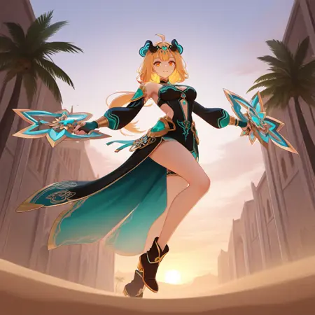 SusannahHi3, Fol003, Ssn_Alt, 金发, 长发, 天线发, 橙色眼睛, 低马尾, 金色镶边, 黑色发饰, 多色连衣裙, 印花裙摆, 青绿色吊颈, 无袖连衣裙, 开衩裙摆, 长裙摆, 黑色裙摆, 渐变裙摆, 青绿色裙摆, 多色裙摆, 黑色连衣裙, 白色连衣裙, 白色裙摆, 露脐剪裁, 露胸剪裁, 露出胸罩, 侧边剪裁, 裸露肩膀, 黑色头环, 青绿色镶边, 青绿色宝石, 替代分离袖子, 替代袖口开衩, 替代黑色袖子, 替代蓬松长袖, 金色腕环, 青绿色新娘臂甲, 多枚戒指, 黑色大腿带,