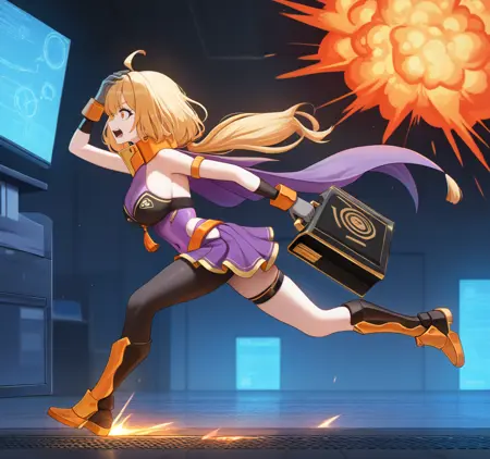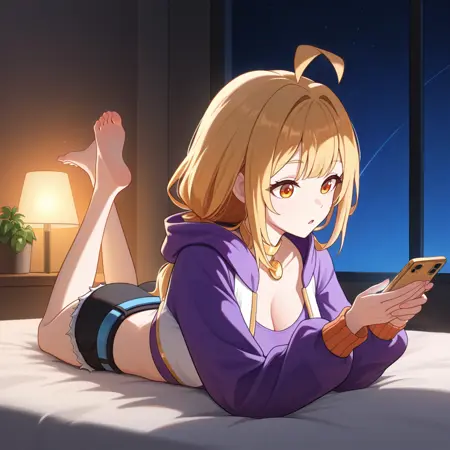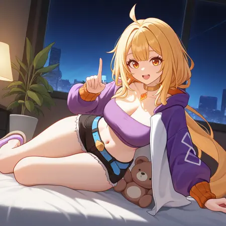 SusannahHi3, Fol02, Ssn_Stg, 金发, 长发, 天线发, 橙色眼睛, 低马尾, 紫色衬衫, 短款上衣, 露胸, 吊坠项圈, 金色项圈, 连帽夹克, 多色夹克, 紫色袖子, 蓬松袖子, 橙色罗纹袖口, 白色夹克, 紫色帽子, 蓝色腰带, 短裤, 短款短裤, 黑色短裤, 露腹, 露脐, 紫色夹克,