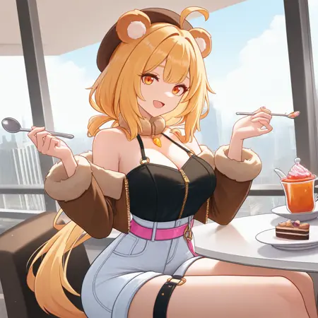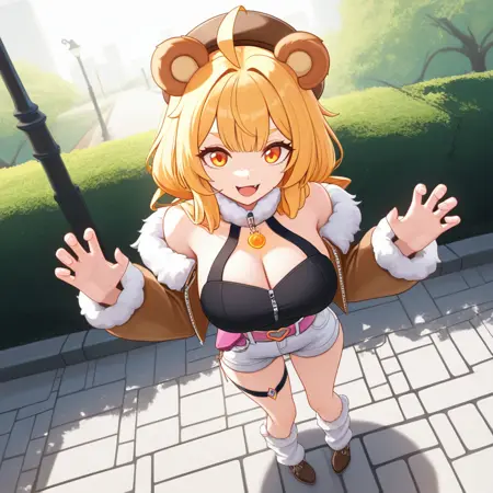 SusannahHi3, Fol002, Ssn_Ber, 金发, 长发, 天线发, 橙色眼睛, 熊耳, 低马尾, 拉链上衣, 黑色衬衫, 露胸, 吊颈上衣, 短款夹克, 露肩夹克, 棕色夹克, 毛皮镶边夹克, 裸露肩膀, 毛皮镶边袖子, 棕色袖子, 大腿吊袜带, 大腿绑带, 高腰衬衫, 牛仔短裤, 白色短裤, 品红色腰带, 拉链, 毛皮领, 棕色头饰, 贝雷帽, 吊坠领,