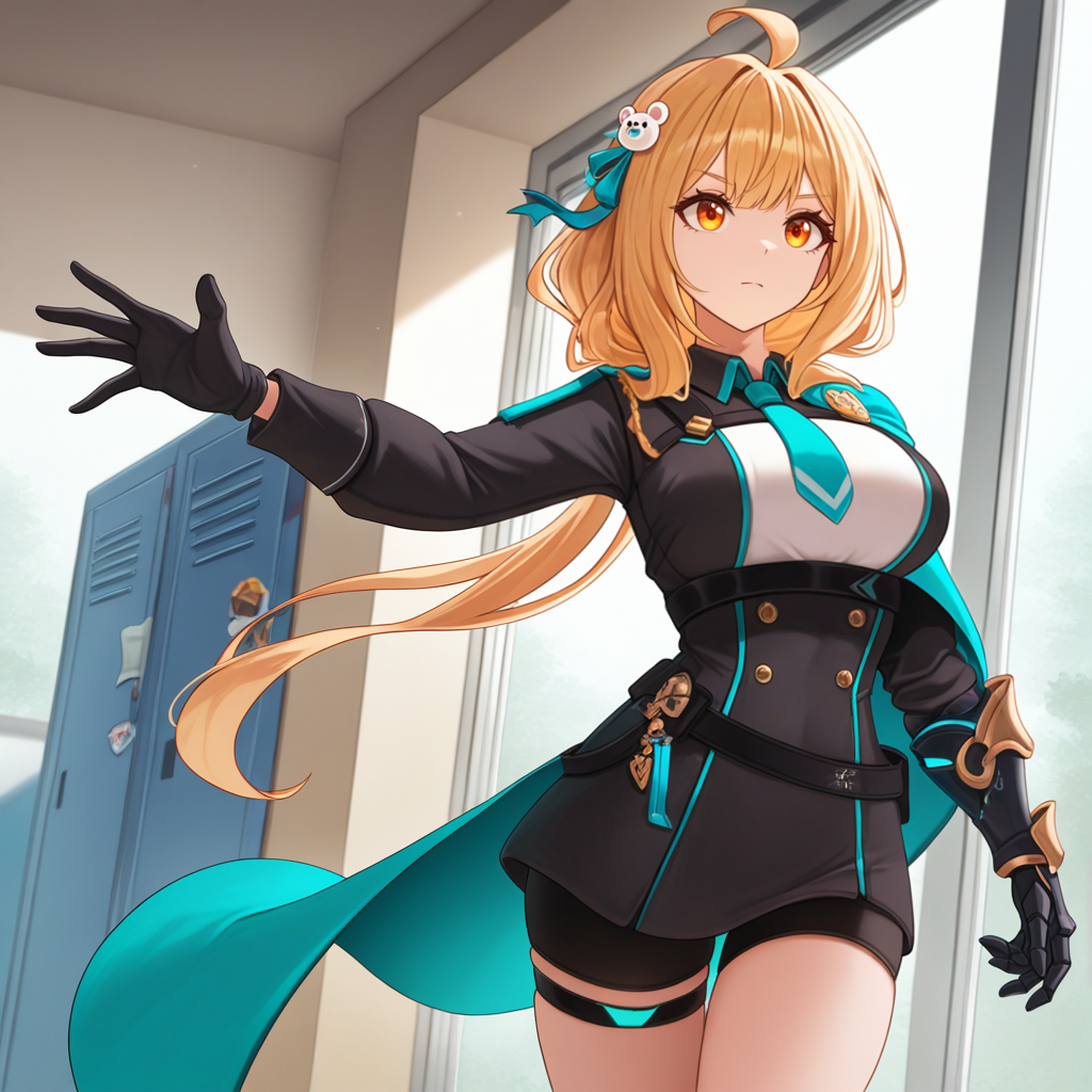 SusannahHi3, Fol001, Ssn_Unf, 金发, 长发, 天线发, 橙色眼睛, 低马尾, 军装, 白色衬衫, 衬衫穿在夹克内, 青绿色领带, 下胸围, 有领夹克, 黑色夹克, 纽扣, 黑色腰带, 胸部腰带, 弹匣(武器), 自行车短裤, 黑色短裤, 黑色大腿绑带, 单肩披风, 青绿色披风, 蓝色丝带, 头发丝带, 熊形发饰, 黑色臂甲, 单侧臂甲, 黑色手套, 长袖, 黑色袖子, 青绿色臂环,