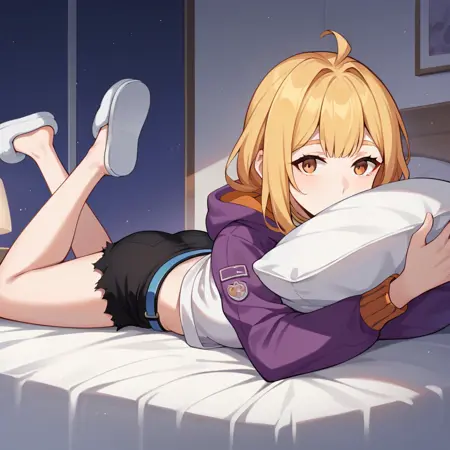 SusannahHi3, Fol02, Ssn_Stg, 금발 머리, 긴 머리, 아호게, 주황색 눈, 낮은 포니테일, 보라색 셔츠, 크롭탑, 가슴 노출, 펜던트 초커, 금색 초커, 후드 재킷, 다색 재킷, 보라색 소매, 볼륨감 있는 소매, 주황색 리브 장식, 흰 재킷, 보라색 후드, 파란 벨트, 컷오프, 짧은 숏츠, 검은 숏츠, 복부 노출, 배꼽, 보라 재킷,