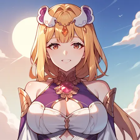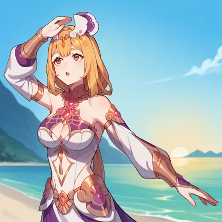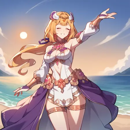 SusannahHi3, Fol001, Ssn_Def, 아호게, 금발 머리, 긴 머리, 주황색 눈, 낮은 포니테일, 팔 없는 드레스, 흰 드레스, 보라색 테두리, 흰색 머리 장식, 보라색 할터넥, 가슴 부분 절개, 브라 살짝 드러남, 흰 브라, 배꼽 절개, 측면 절개, 장신구, 보라색 보석, 보라색 허벅지 줄, 금색 테두리, 흰 치마, 보라 치마, 이색 치마, 어깨 노출, 분리된 소매, 소매 절개, 흰 소매, 볼륨감 있는 긴 소매, 금색 손목 장식, 보라색 웨딩 장갑, 여러 개의 반지, 긴 치마, 열린 치마,