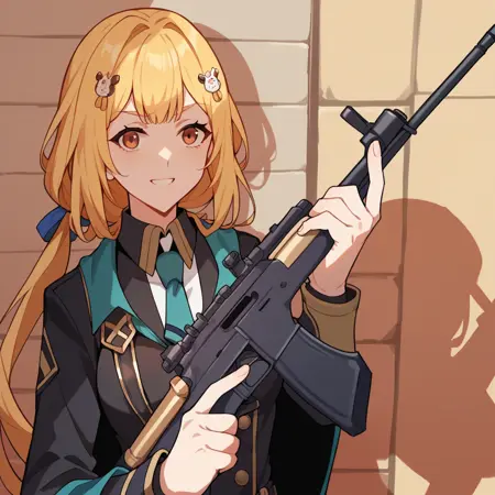 SusannahHi3, Fol001, Ssn_Unf, 금발 머리, 긴 머리, 아호게, 주황색 눈, 낮은 포니테일, 군복, 흰 셔츠, 재킷 안에 셔츠, 티올색 넥타이, 언더버스트, 칼라가 있는 재킷, 검정 재킷, 단추, 검은 벨트, 가슴 벨트, 탄창(무기), 바이크 숏츠, 검은 숏츠, 검은 허벅지 스트랩, 한쪽 어깨용 망토, 티올색 망토, 파란 리본, 머리 리본, 곰 머리 장식, 검은 장갑, 한쪽 장갑, 검은 장갑, 긴 소매, 검은 소매, 티올색 팔찌,