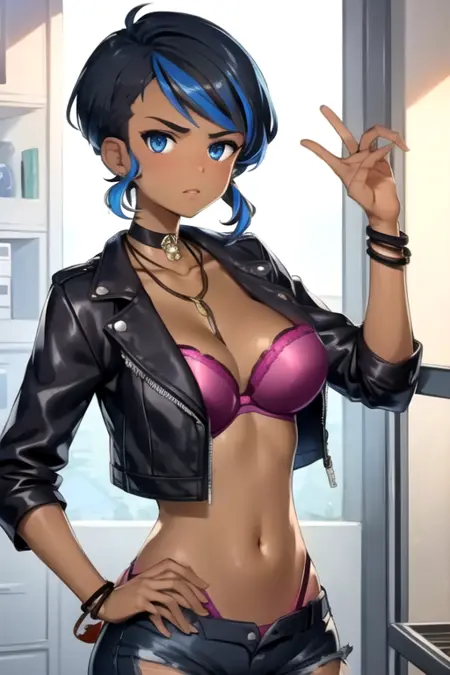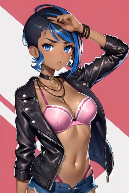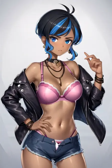 | トレーニングワード | JessyBC, 1girl, solo, short hair, blue eyes, black hair, navel, cleavage, jewelry, medium breasts, blue hair, streaked hair, black jacket, earrings, short shorts, choker, midriff, dark skin, necklace, pink bra, bracelet, open jacket, dark-skinned female, pink panties, cropped jacket, blue shorts, open fly, cutoffs, leather jacketコピーしました! |
