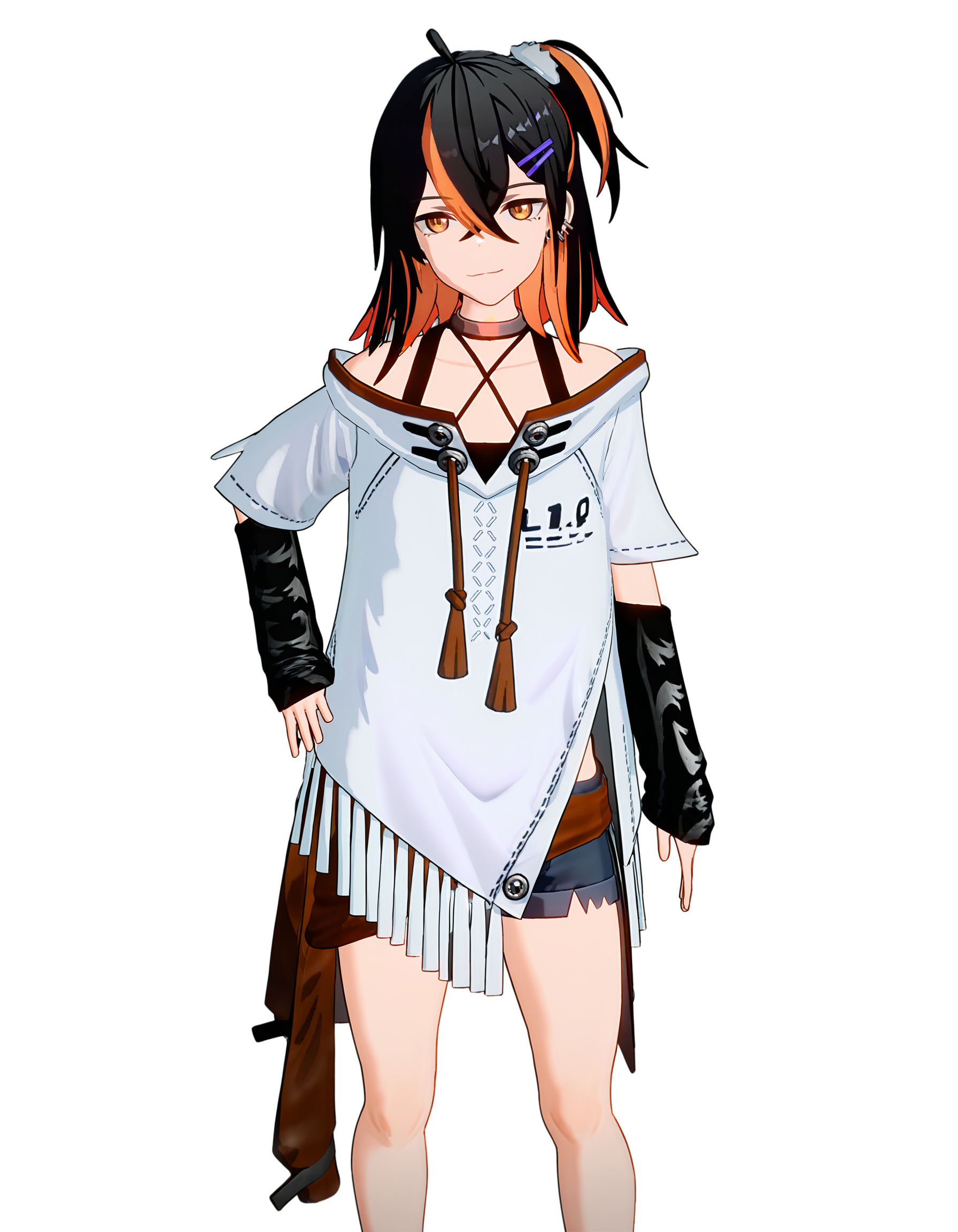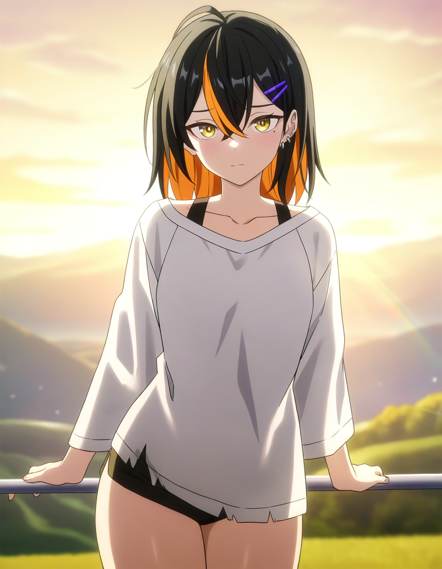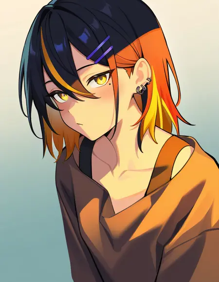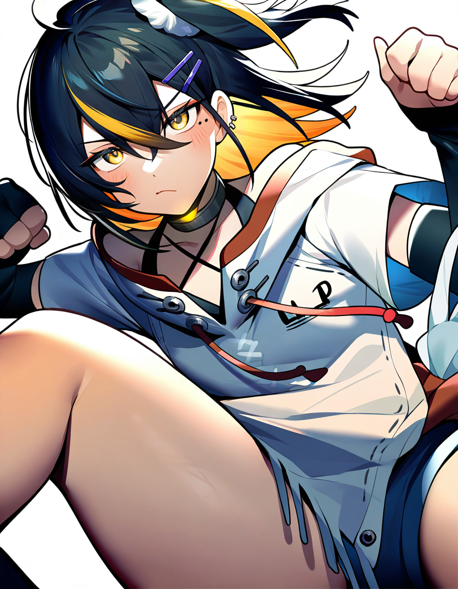 naina,1girl,solo,black hair,multicolored hair,hairclip,hair ornament,yellow eyes,blonde hair,mole under eye,mole,ear piercing,collarbone,medium hair,hair between eyes,piercing,bangs,orange hair,streaked hair,two-tone hair,jewelry,jacket,criss-cross halter,white hoodie,short sleeves,bare shoulders,halterneck,shirt,short shorts,elbow gloves,fur trim,