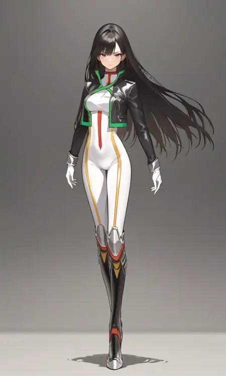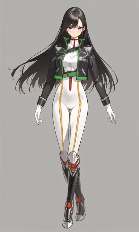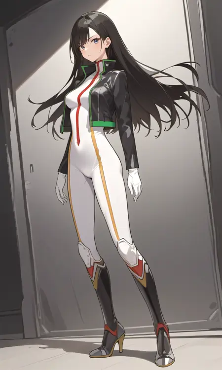 Rosweise,slender woman ,long black hair,bangs swept to the right,white bodysuit, black jacket, white gloves,high heels, boots,