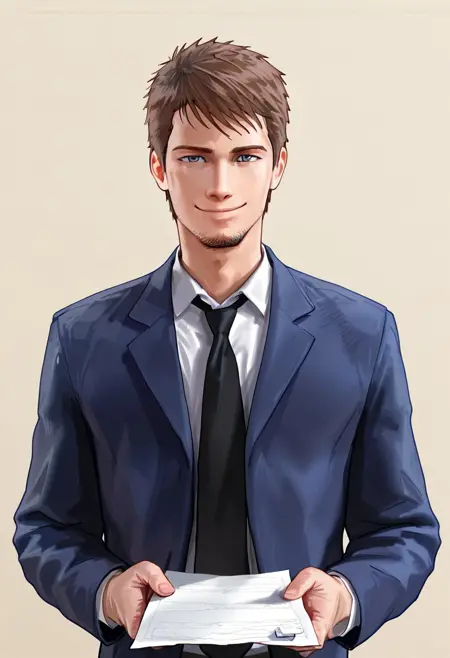 외모 태그(선택 사항): 갈색 머리, 수염, 회색 눈, 34세
